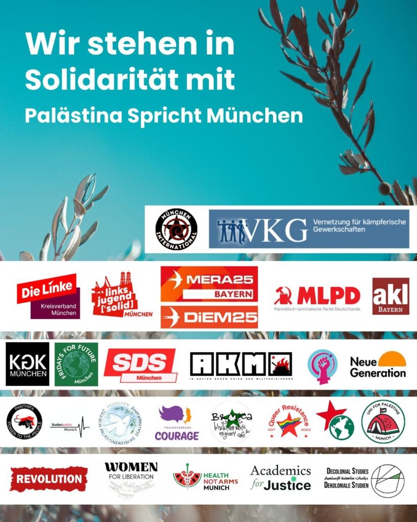 Mit wachsender Besorgnis verfolgen wir als anti-rassistische, anti-faschistische und linke Gruppierungen in München die zunehmende politische Agitation und Diskriminierung, die sich gegen palästina-solidarischen Aktivismus, insbesondere die Gruppierung Palästina Spricht München richtet. Wer sich in München gegen Israels Genozid-, Apartheid- und Besatzungs-politik in Palästina ausspricht, sieht sich aktuell mit Verleumdung und institutionalisierten Repressionen konfrontiert.