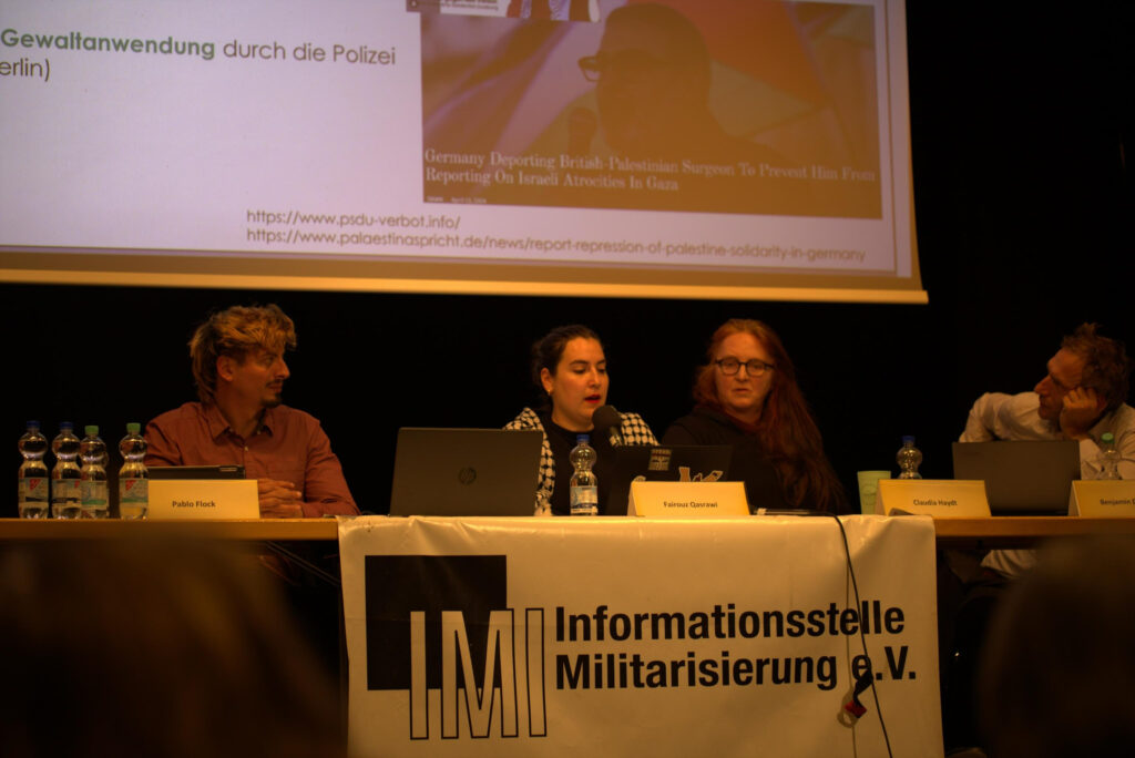 Dr. Qasrawi sprach im abschließenden Panel „Recht und Öffentlichkeit der Militärrepublik“, das sich neben verschiedenen Aspekten der Militarisierung der Bundesrepublik auch explizit mit dem Genozid in Gaza und der deutschen Mittäterschaft befasste. In ihrem Beitrag analysierte sie die zunehmende Repression gegen die palästinasolidarische Bewegung in Deutschland. Anhand des Beispiels München zeigte sie auf, wie ein Zusammenspiel aus kommunalen Strukturen, Behörden und zivilgesellschaftlichen Akteuren ein repressives Dispositiv bildet, das diese Einschränkungen legitimiert und durchsetzt.